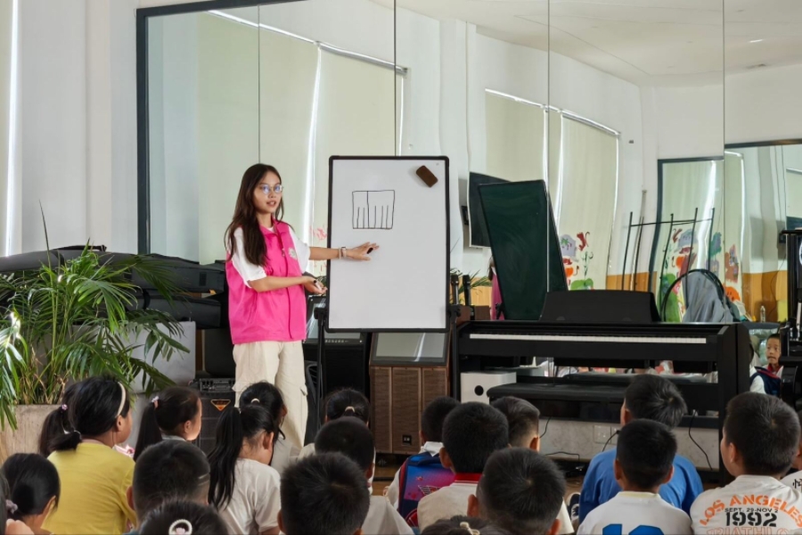 踏着清晨的朝阳,孩子们早早地来到活动中心,开始一天的课程。金银山社区是苗彝聚居地,为了让孩子们更好地了解自己民族的文化,队员吴彦林选取了极具特色的彝族服饰为主题,给低年级的孩子们带来了一节彝饰非遗课。课上,孩子们用具有彝族特色的不同花纹纸片,充分发挥想象力,剪贴出一张又一张属于自己的“民族服饰”。中年级的第一节课是队员邬玥的身心成长课,她从世界上的每一片树叶都有不同的特点出发,教会孩子们欣赏自己、欣赏他人,在和朋友们的交往中做更好的自己。在音乐课上,队长陈曼妮带领孩子们认识了钢琴的琴键。一个个奇妙的音符从她的指尖流出,孩子们围着钢琴唱着音阶,从琴键感受音域之广、音乐之美。