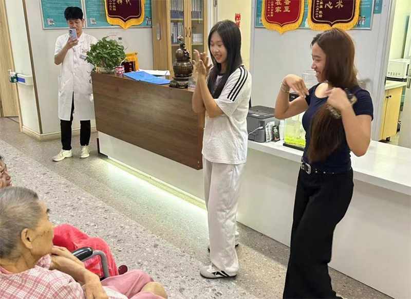 图为实践团成员给老人跳舞