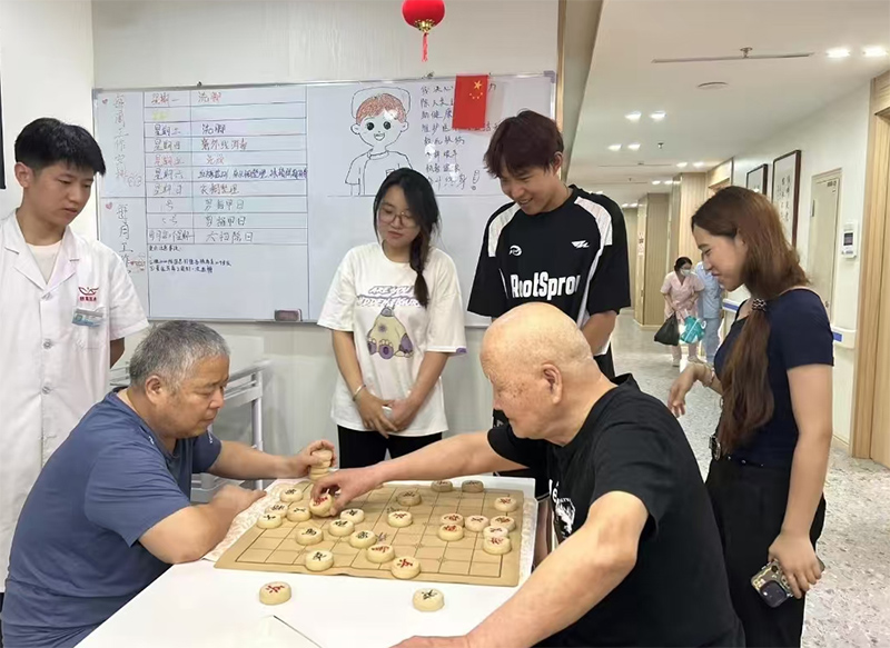 在走廊里实践团成员看到了两位老人,于是实践团成员开始与老人进行聊天,并且在旁边看老人下象棋。同时也知道了老人的近期的一些生活状况和身体状况。