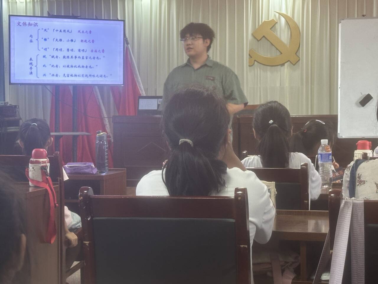 今天下午的第一节课由我给孩子们带来一节语文课。本节课主内容是诗歌《蒹葭》,我先跟孩子们介绍了其出处《诗经》,随后带领大家认识生字词,然后进行朗读,最后在朗朗的读诗声中,我们结束了这节课。