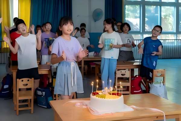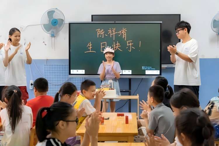 因爱成长,与爱同行。四年级一班班主任胡尧在与孩子们的沟通交流中,得知几天后是班里一位同学的11岁生日,于是与队员们共同商议策划生日惊喜,并为她精心准备美味的生日蛋糕和牛奶。生日当天,在孩子们的惊喜声中,管自远和徐梓涵端着点好蜡烛的生日蛋糕走进教室,张诗棋悄悄将生日帽戴在小寿星的头上。小寿星激动地向老师与同学们挥舞双手,绚烂童真的笑容绽放在她稚嫩的脸上。“祝你,生日快乐,祝你,生日快乐……”在欢乐轻快的背景声中,孩子们与老师合唱生日快乐歌,献上最诚挚的生日祝福。随后,队员们将切好的生日蛋糕与牛奶发给全班同学。小寿星和同学们品尝完蛋糕后,班主任胡尧代表支教队全体队员向小寿星赠送生日礼物——兔子玩偶,祝愿她在今后的人生中像小兔子一样活泼可爱。最后,同学们纷纷在旺仔牛奶的包装纸上留下对小寿星的美好祝福,用淳朴可爱的方式表达着自己对同学的衷心祝福。