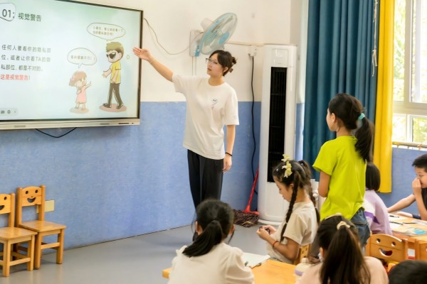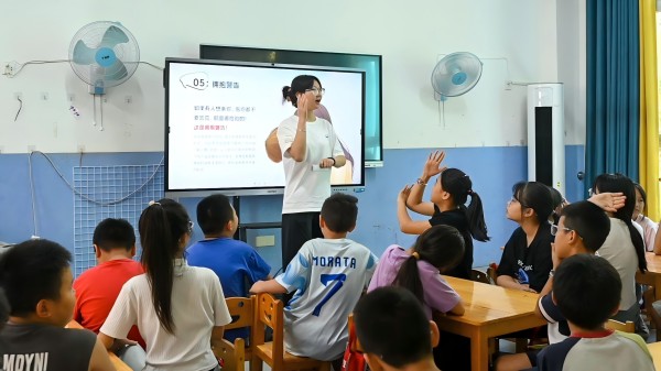 预防性侵,护航成长。讲座正式开始前,“蜀光”支教队队员王诺婷播放与“自我保护”相关的视频,引入讲座主题——防性侵安全教育,讲座分为保护好“身体泡泡”、怎么分辨性侵害和自我防卫小知识三部分。首先,王诺婷提出视觉警告、言语警告和触碰警告等五个警告原则,图文并茂,通过互动交流、案例分析等多种形式,详细讲解“身体泡泡”的内涵,明确触摸界限。随后,王诺婷邀请学生上台进行情景模拟,帮助学生学会辨别潜在的危险信号,学习如何应对突发事件,并通过现场问答形式,检验学习成果,强化安全意识。学生们热情高涨,踊跃回答,积极参与课堂。随后,王诺婷分享三个自我防卫法则,教授同学们如何正确保护自己,预防不良事件的发生。最后,支教队员与学生们齐唱预防性侵害拍手歌,强调课程要点,巩固安全防护知识。