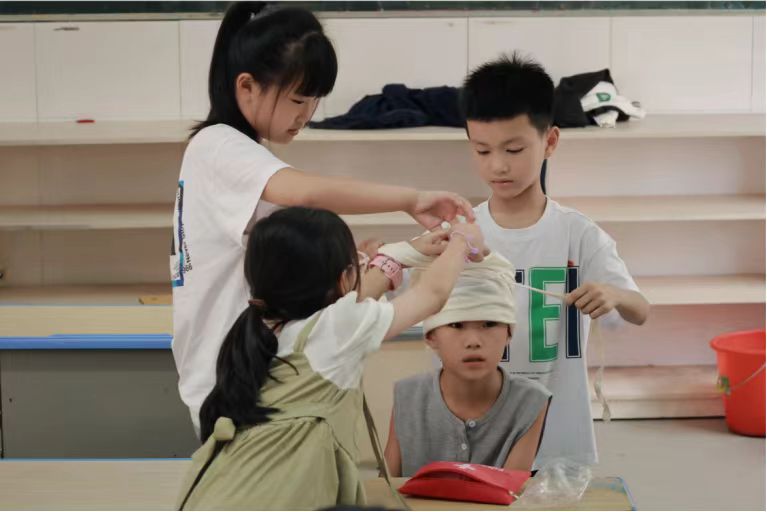 图为小候鸟们学习包扎知识。通讯员 单彤彤 摄