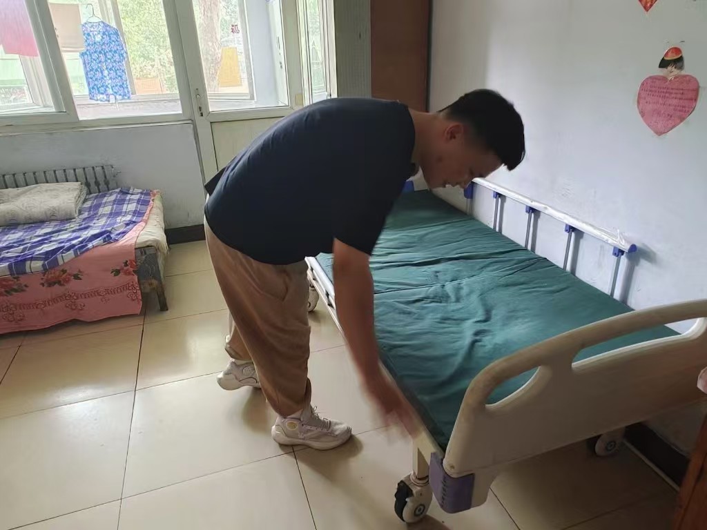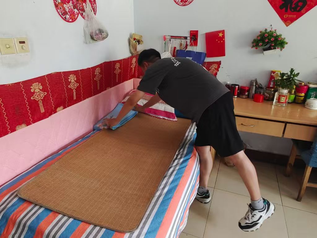 注:图为“青春无畏”实践团成员崔清程帮老人整理床铺