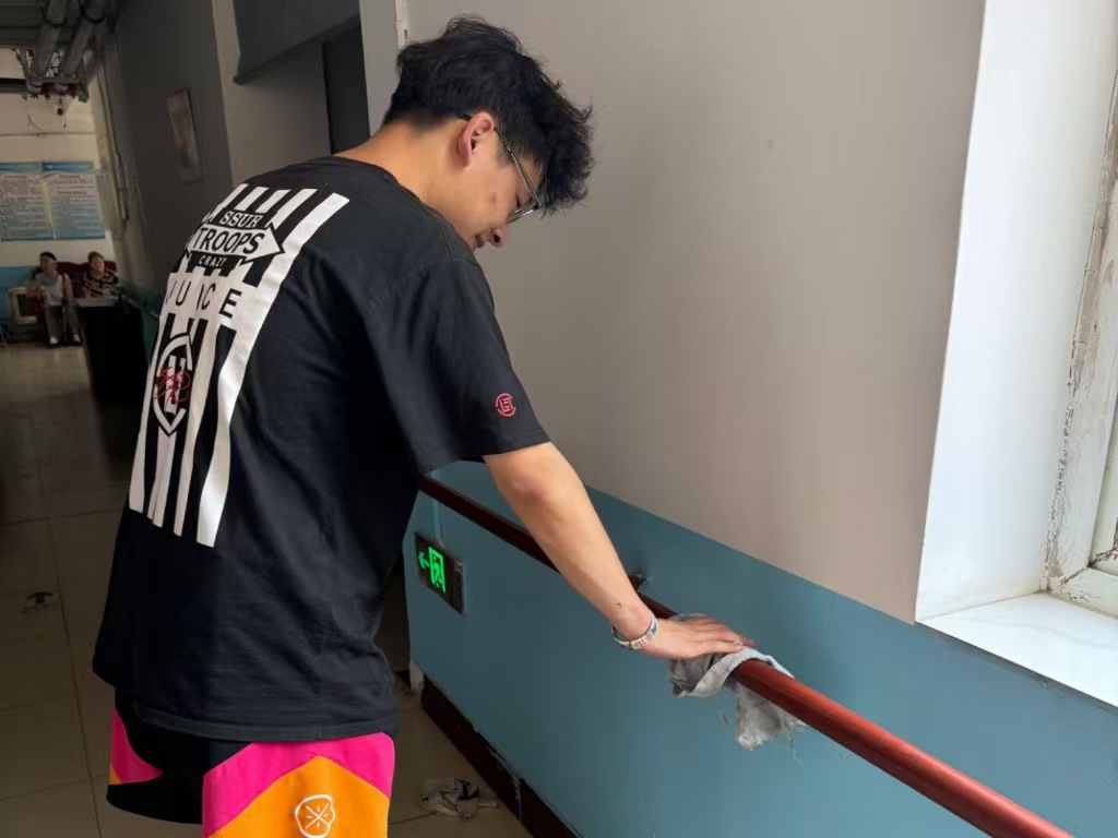 注:图为“青春无畏”实践团成员王晓程帮老人打扫走廊