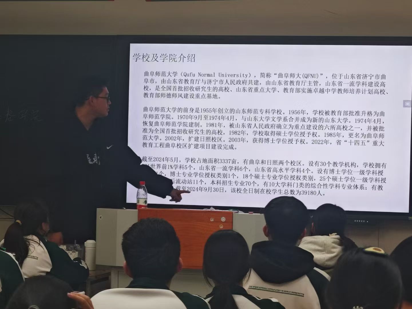 为充分发挥朋辈传递作用,分享讲解备考经验,吸引更多优质生源,通过挖掘校史资料、开展校史宣讲等方式,增强学生身为“曲园人”的自豪感和认同感,1月20日晚,曲阜师范大学学长经验助前行社会实践队前往辽宁省锦州市渤海大学附属高级中学进行了“返母校升学宣讲”社会实践活动,向高中生们介绍了学校建校历史、师资力量、教育特色、报考情况、学科建设、人才培养、校园文化、招生政策等内容,同时引导他们进行了对大学生活和高中阶段学习方法的探索和思考。