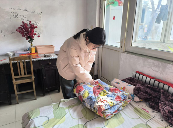 图为实践团成员侯科帆为老人整理床铺叠被子