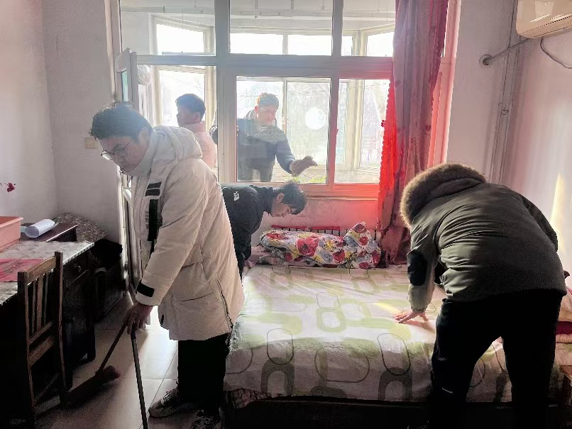 注:图中为袁志远 王航 吴国灿 吴利伟给老人的房间打扫卫生