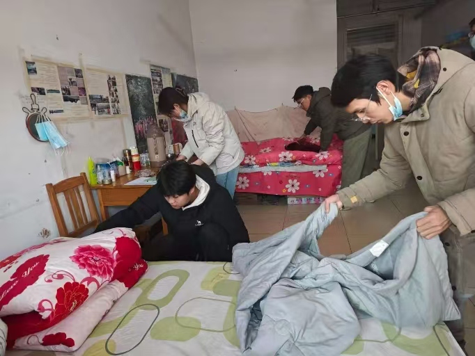 注:图为实践团成员李宏丞、张梦荣、范晓宇、梅中国为老人整理内务
