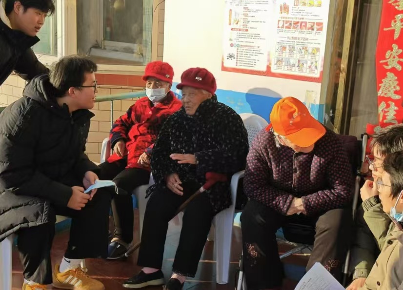 注:图为实践团成员李宏丞、季文毅、范晓宇、梅中国与老人沟通