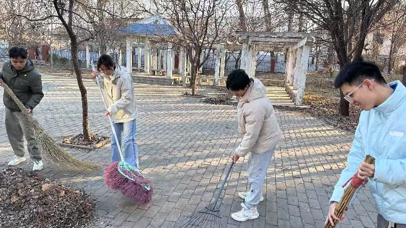 注:图为实践团成员范晓宇、张梦荣、刘毅、魏俊杰打扫枯叶