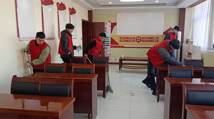 除了日常的服务工作,实践团还积极参与社区环境整治。在会议室,他们分工协作,清扫地面、擦拭桌椅、整理物品,确保室内整洁有序。在社区其他公共区域,志愿者们也拿起清洁工具,认真打扫,让社区环境更加整洁舒适。