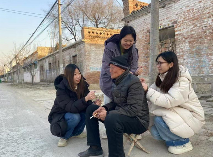 图为实践团成员陈延俊、丁佳怡、杨帆、在给老人捏背