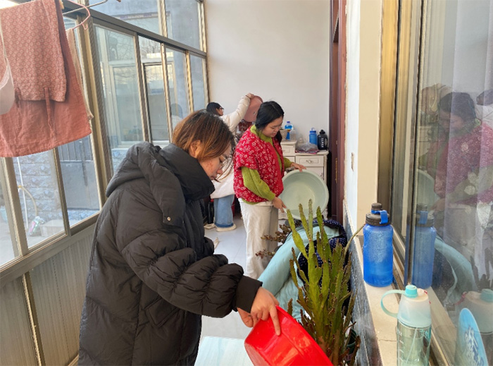 图为实践团成员杨帆、陈延俊、陈思宇、在浇花浇树