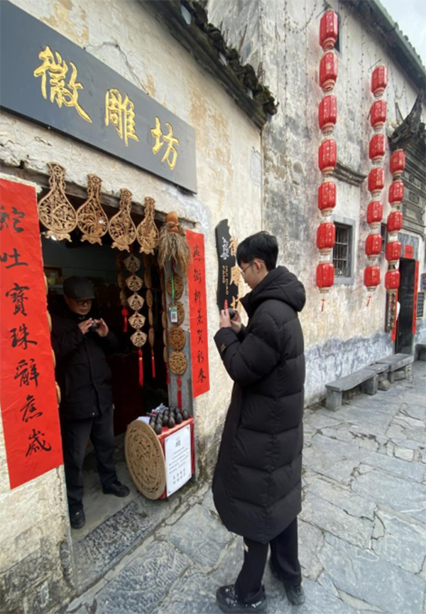 共赴徽州古城,感悟徽派雕艺 2月5日,实践队伍抵达歙县徽州古城细致探寻徽派雕饰,通过观察记录“徽州三雕”分析雕刻技艺及其文化内涵,并采访技艺传承人,了解一件工艺品的生产过程,队员们无一不被传统手艺人一丝不苟的工匠精神深深折服。