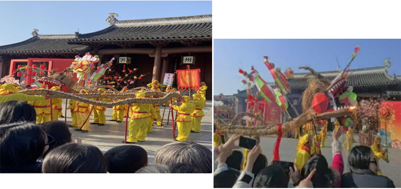 舞草龙的起源可以追溯到古代,最初可能是作为一种祭祀活动出现的。随着时间的推移,它逐渐演变成了一种庆祝丰收、祈求平安和健康的文化习俗。舞草龙的制作材料主要是稻草,这不仅体现了当地的农业特点,也象征着丰收和希望。在表演时,草龙被插上点燃的香火,形成一条“火龙”,在村庄中舞动,场面十分壮观。舞草龙的过程中,还有各种传统的舞蹈动作和阵法,如“打草惊蛇”、“二龙戏水”等,这些都增加了活动的趣味性和观赏性。舞草龙不仅是娱乐活动,它还承载着重要的社会功能。首先,它是一种社区凝聚力的体现,通过共同参与制作和表演草龙,村民们增强了彼此之间的联系和团结。其次,舞草龙也是一种文化传承的方式,它将传统的民间艺术和信仰传递给年轻一代。此外,舞草龙还具有一定的教育意义,它教导人们尊重自然、感恩丰收,并希望通过集体的努力带来更好的生活。实践队伍在徽州府衙门前观赏舞草龙活动,感受徽州独特的风俗文化。