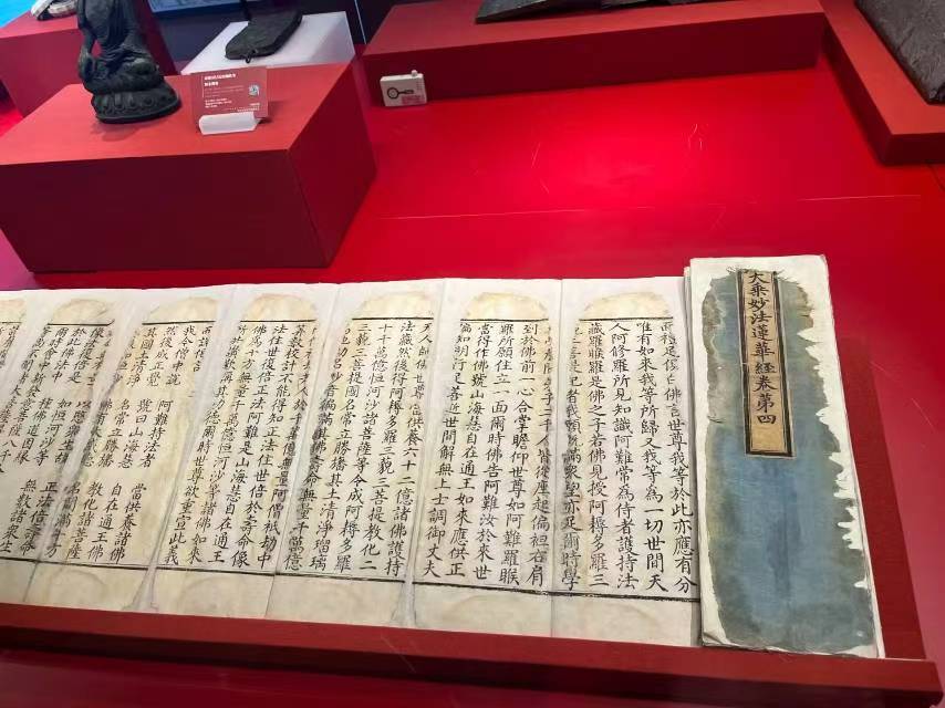 踏入济宁市博物馆,古朴的建筑外观与现代的设计理念相得益彰。走进馆内,一场以珍贵古籍为核心的展览正在有序开展。展台上,《大乘妙法莲华经卷第四》等古籍散发着独特的历史韵味。泛黄的纸张、工整的字迹,经历了漫长岁月的洗礼,依然保留着古朴的质感。仔细端详,经文内容详实,书法风格刚劲又不失灵动,淋漓尽致地展现出古代书法艺术的高超水准和佛教文化的深厚底蕴。