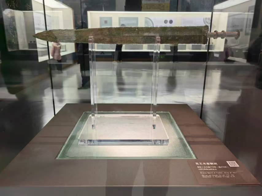 吴王夫差铜剑静静陈列于展柜中,虽历经岁月沧桑,铜锈斑驳,却难掩其昔日的锐利与威严。剑身修长,剑柄纹路清晰,仿佛在诉说着往昔的金戈铁马。据博物馆工作人员介绍,此剑不仅是精湛的古代兵器,更是研究春秋时期历史、军事与铸造工艺的重要实物资料。