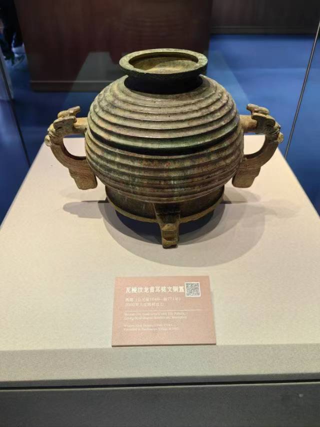 瓦棱纹龙首耳蟠螭纹铜簋同样吸睛。它造型古朴典雅,圆腹下三足鼎立,两侧龙首形耳栩栩如生,仿佛即将腾空。器身的瓦棱纹与蟠螭纹相互映衬,线条流畅且富有韵律,尽显古代工匠的高超技艺与审美水准。工作人员表示,铜簋在古代主要用于盛放祭祀和宴飨食物,是重要礼器,对研究古代礼仪制度和文化传统意义重大。