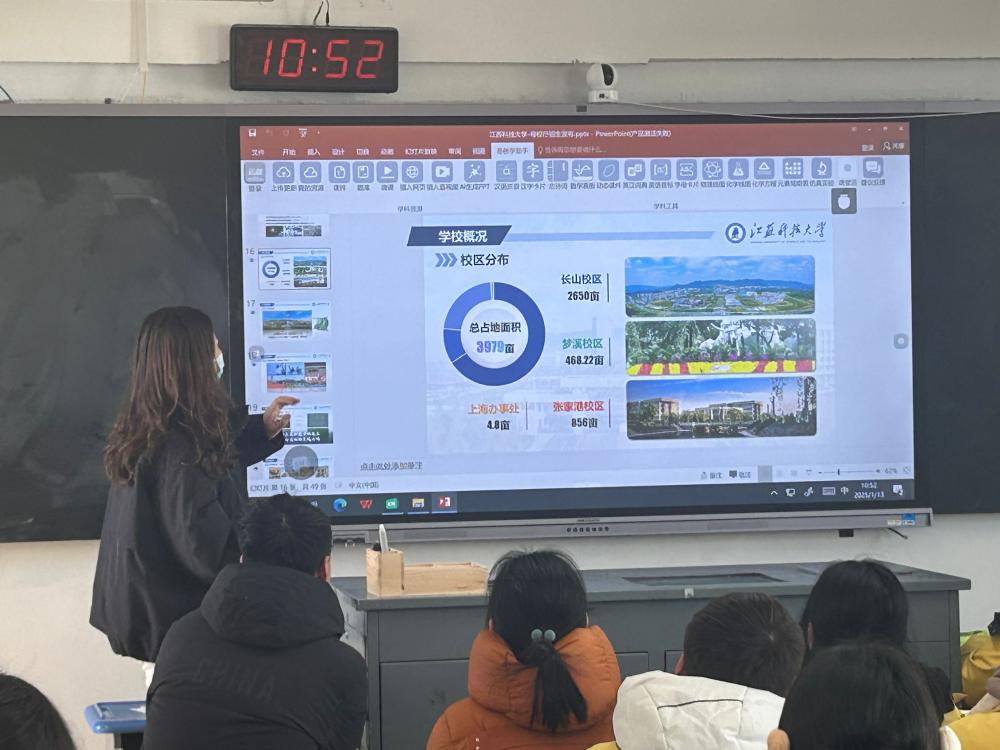 在就业发展方面,宣讲者们分享了江科大毕业生的就业情况、行业分布及薪资待遇等信息,让高中生们对江科大的就业前景有了更加清晰的认识。此外,他们还播放了一段镇江介绍视频,展示了镇江的自然风光、人文景观及经济社会发展情况,让高中生们对镇江这座美丽城市产生了浓厚的兴趣。