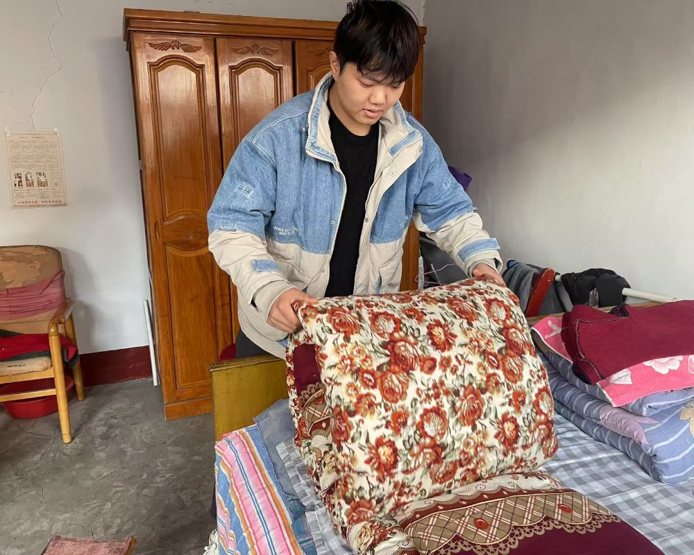 图为实践成员邵嘉琪在帮老人整理床铺