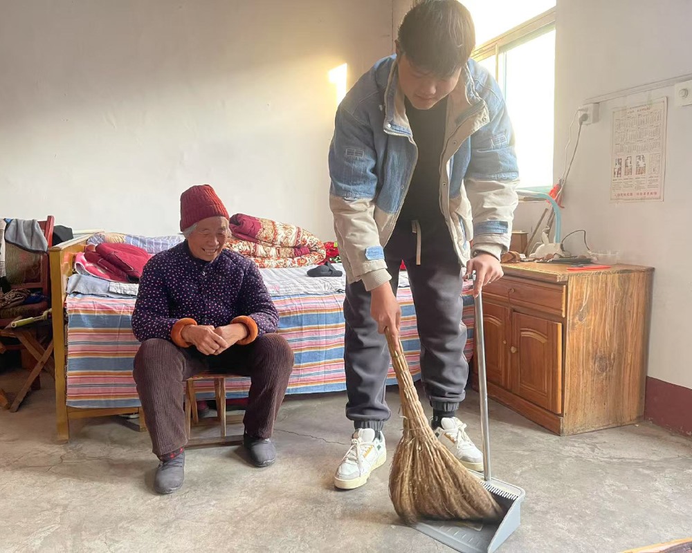 图为实践成员邵嘉琪在帮老人打扫卫生