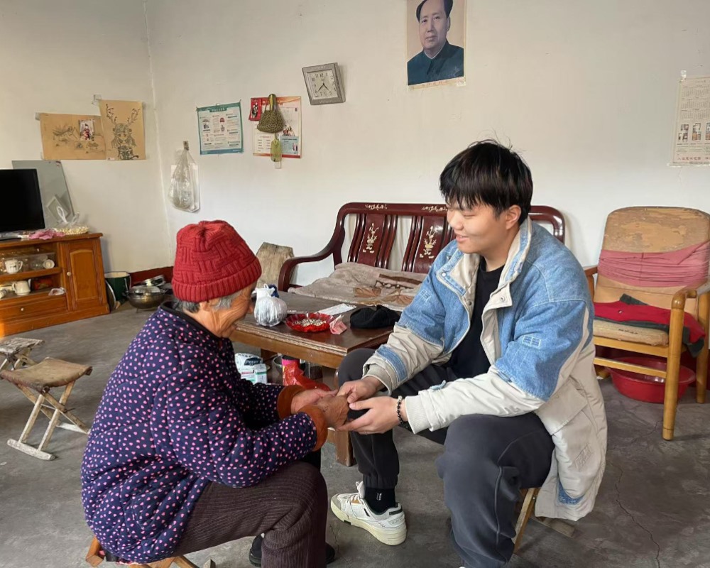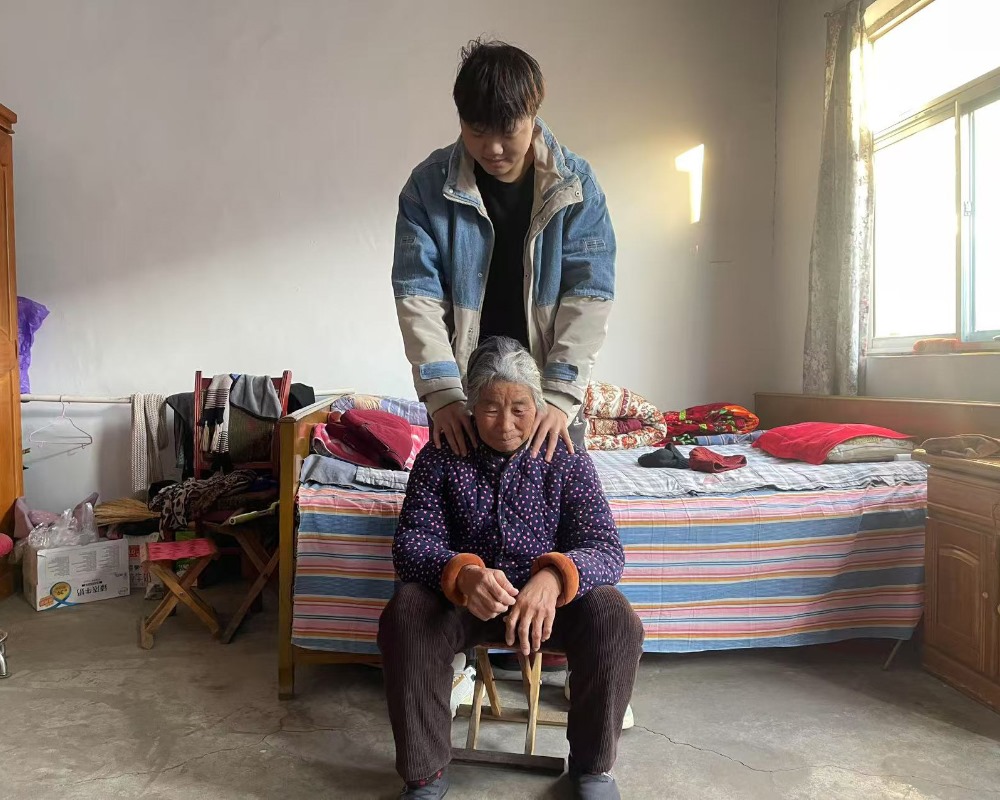 图为实践成员邵嘉琪在帮老人按摩