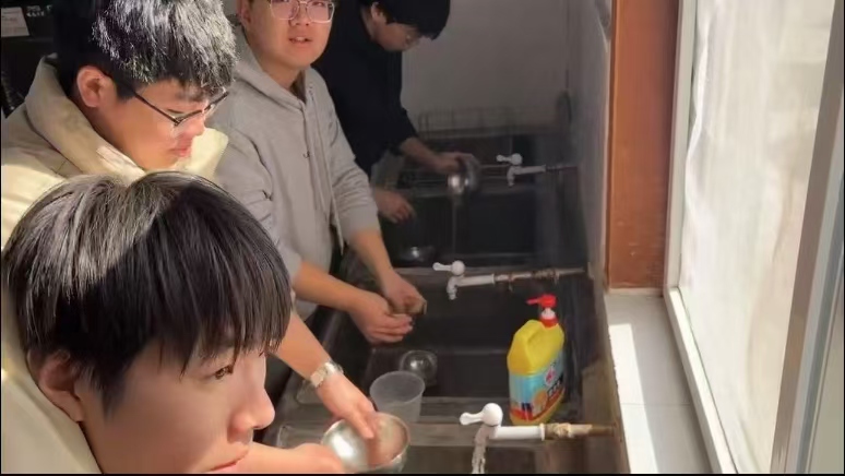 用餐结束后,同学们主动承担洗碗工作,他们分类摆放餐具,有人负责去油污,有人冲洗、擦干归位。虽工作琐碎,但大家认真专注,毫无怨言。