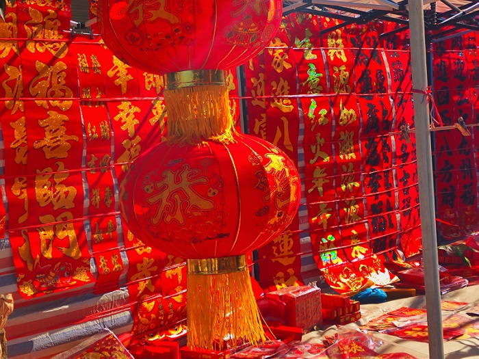 写有吉祥话语的春联、高高悬挂的红灯笼,同样是集市上的一道亮丽风景。摊主热情地向顾客介绍春联的含义与特色,红色的纸张与金色的字体相得益彰,营造出浓浓的年味。红灯笼造型精美,寓意团圆红火,是春节不可或缺的象征。