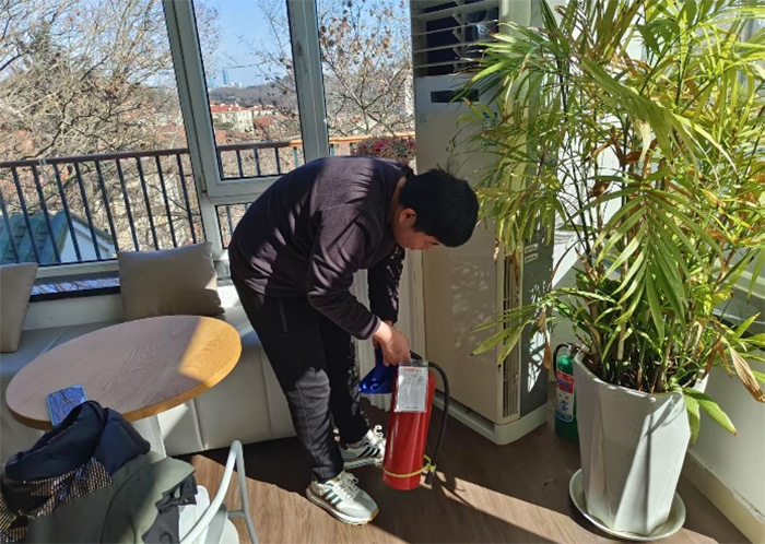 在活动的闲暇时间,实践团成员仔细检查每一个灭火器,查看压力表指针是否处于正常范围,确认灭火器的生产日期,确保在有效期内。同时,实践团成员还需检查灭火器的罐体是否有变形、损伤等情况,保证其能够使用。