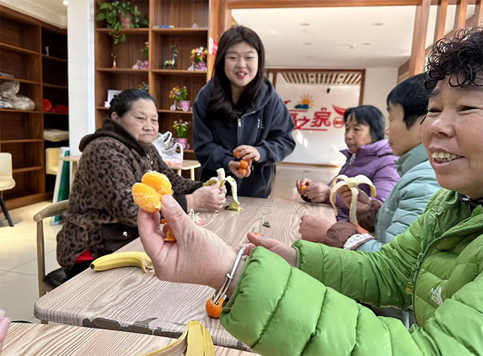 同学们与老人们一起玩起了介绍水果的游戏,老人们争先恐后的分享自己对于水果的认知,敬老院处处都被老人们的欢声笑语所渲染。