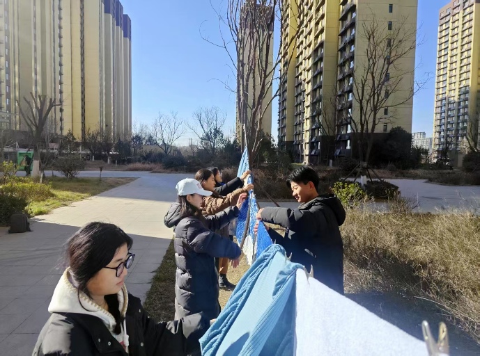 考虑到冬季阳光充足但气温较低,成员们还主动帮助行动不便的老人晾晒被褥。在楼下的空地上,几名实践团成员协作展开厚重的棉被,一边抖动拍打,一边将其整齐晾晒在晾衣条上,力求让老人们满意。
