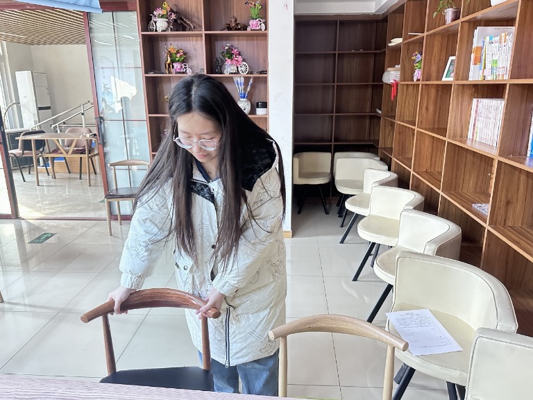 图为实践团成员何栩瞳整理房屋