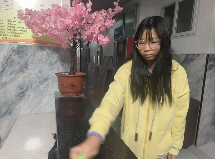活动期间,团队成员用抹布擦拭养老院的桌面、门窗。用双手为养老院打造整洁环境。