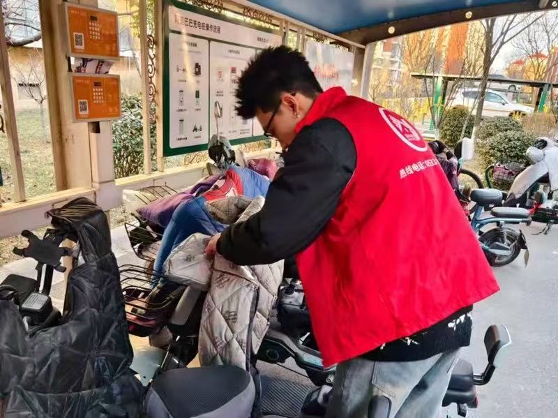 图为实践成员正在规范社区电动车摆放和电动车乱放
