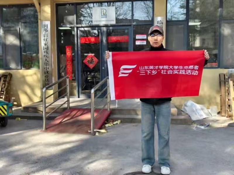 图为实践成员在当地所实践的社区门口进行三下乡实践活动个人旗帜的照片