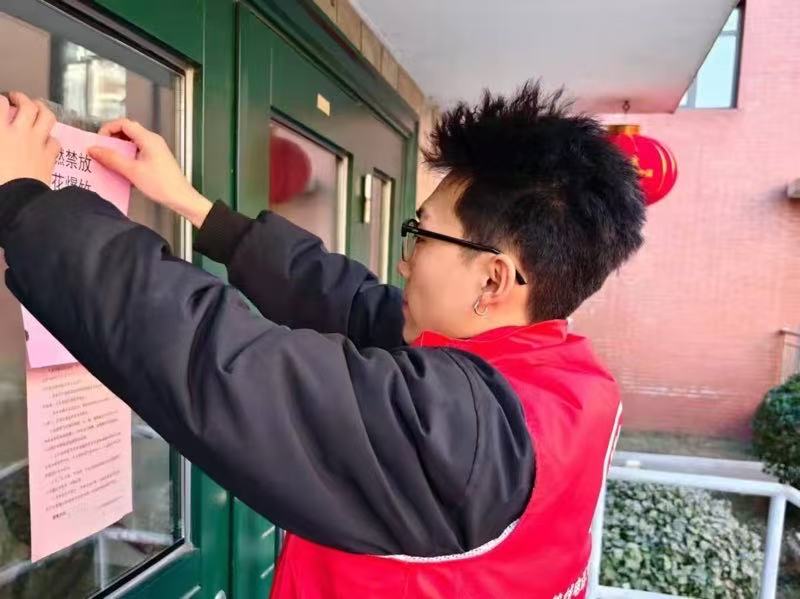图为实践成员正在张贴春节期间禁止燃放烟花爆竹的警示纸