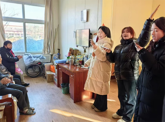 图为实践团成员马雯娴、韩晓悦、李文琪给老人们唱歌