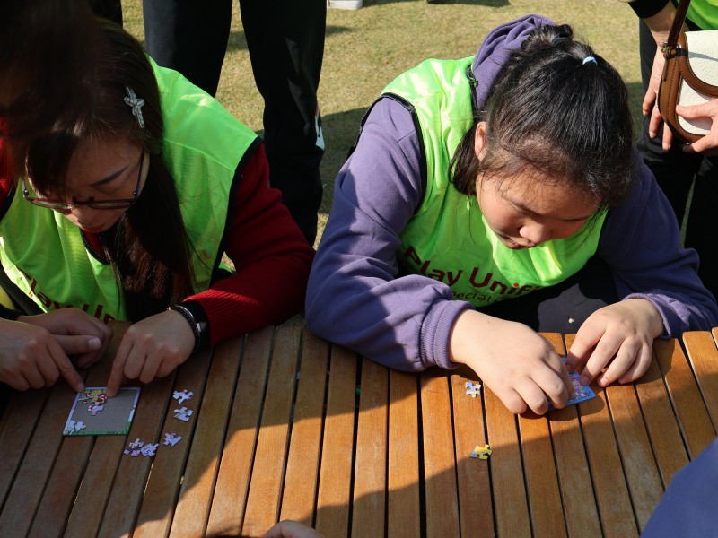 在认知能力训练中,服务队选择拼图游戏,通过拼图,孩子可以锻炼多种认知技能,包括空间感知、问题解决、手眼协调、注意力集中和逻辑思维等。在拼图游戏中服务队队员根据孩子的能力,选择图案简单、片数较少和孩子们感兴趣的主题拼图。激发他们的参与的兴趣以及完成拼图获得乐趣和成就感。
