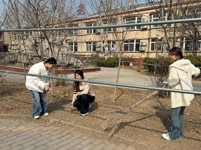 活动当天,实践团成员早早到达祥和苑,协助老年公寓的日常维护工作。院子里,一位身着白色羽绒服的志愿者与同伴合作,用扫帚清扫地面,另一人则用簸箕收集垃圾。偶尔,他们会停下来,与坐在一旁的老人聊上几句。老人中,一位戴着紫色毛帽的阿姨手舞足蹈,似乎在讲述有趣的故事,引来志愿者们的笑声。另一边,几名年轻人走进室内,手持清洁工具,为走廊增添了整洁的气息。一名穿着灰白夹克的志愿者站在桌旁,整理着擦拭后的工具,动作利落,不时与旁人交流。
