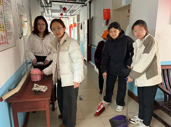 实践过程中,志愿者们的身影频现于老年公寓的各个角落。上午时分,一群学生聚集在院外,与一位坐着的老人互动。她身着花色毛衣,神采奕奕地回应着年轻人的提问,旁边还有人蹲下身倾听。另一场景中,几名志愿者站在楼道内,手持拖把和扫帚,认真清扫地面,墙上的红灯笼与国旗增添了几分节日气氛。下午,阳光渐暖,志愿者们继续忙碌,有人帮老人整理衣物,有人则陪同散步,院落里不时传来欢声笑语。