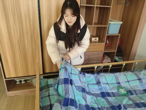 万佳慧贴心地为老人叠被子、潘文琪晒被子,让老人们能在温暖的被窝里安睡。