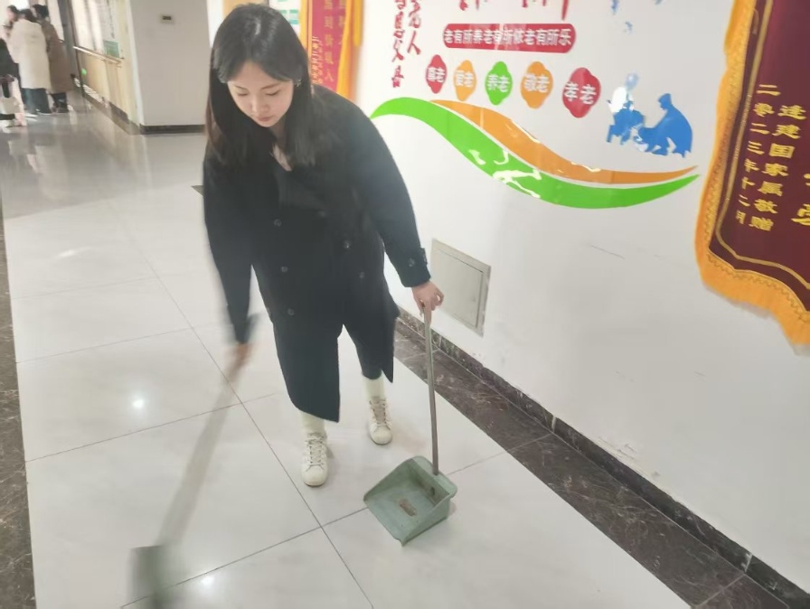 图为实践团成员李梓萱打扫养老院楼道卫生