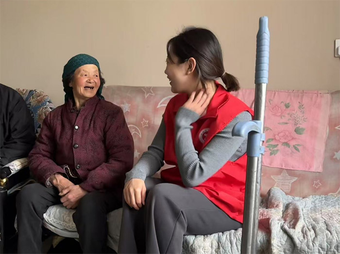 活动首日,实践团成员早早来到祥和社区,探访了多位独居老人。图中,一位身穿红色志愿服的年轻女子正与一位年过八旬的老太太亲切交谈。老人坐在沙发上,脸上洋溢着笑容,双手紧握着拐杖,似乎在诉说着日常生活的点滴。而志愿者则耐心倾听,偶尔点头回应,气氛温馨而融洽。据社区居民介绍,这位老人因行动不便,平时较少与外界接触,志愿者的到来让她感到格外欣慰。随后,志愿者们还为老人整理房间,检查家中安全隐患,确保生活环境更加舒适。