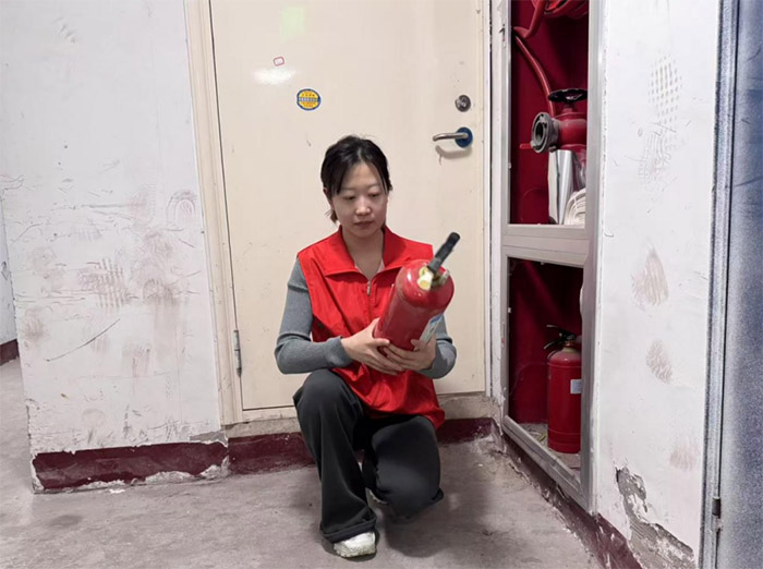 除了探访老人,志愿者还积极参与社区环境整治工作。图中另一场景显示,一名志愿者身着红色马甲,跪在地上从消防柜中取出灭火器,仔细检查其使用状态,确保设备完好无损。这一系列行动体现了实践团对社区安全的高度关注。