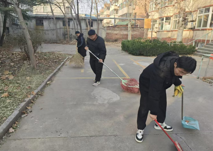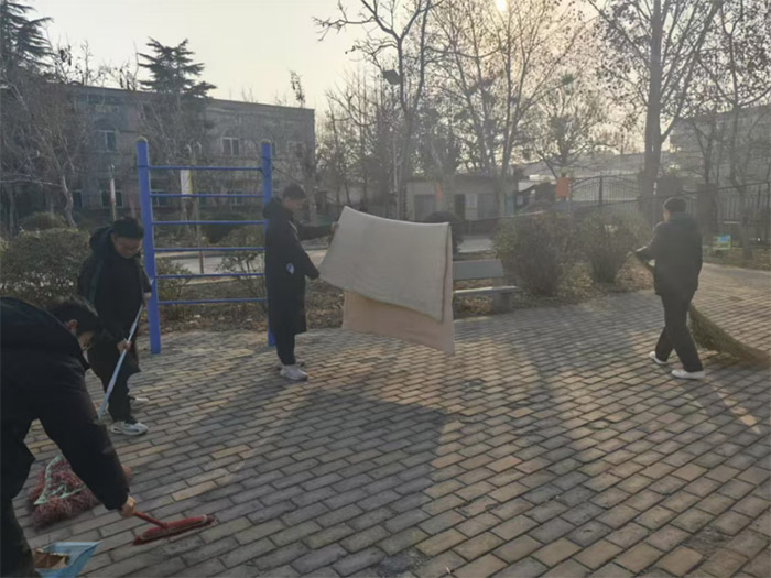 在室外活动区域,成员们不仅清扫落叶,还对公寓内的长椅、健身器材进行了清洁与维护。图片中展示了团员们齐心协力的场面,有的在拂去地面灰尘,有的举起床单进行拍打,有的用扫帚认真清扫着走道。通过他们的努力,室外环境焕然一新,也让老人们在公寓内的活动更加舒适。