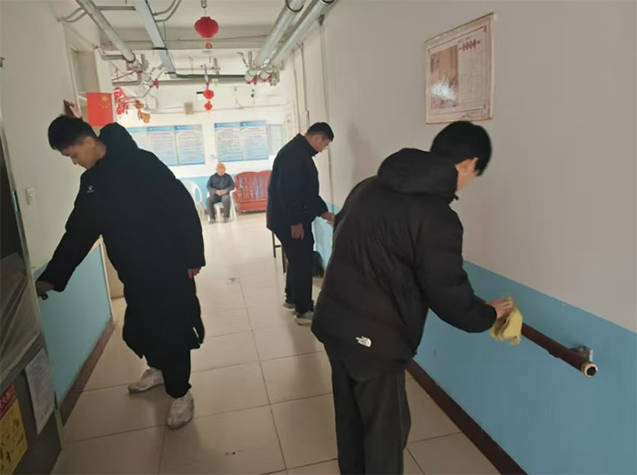在为期七天的实践活动中,实践团成员们积极参与到老年公寓的各项清扫与整理工作中,帮助老人们营造一个更为干净、整洁的生活环境。为了确保老年公寓的卫生条件,团员们首先对公寓内外的地面进行了全面清扫。成员们一边扫地一边互相协作,力求将每个角落都打扫干净,确保环境的整洁有序。