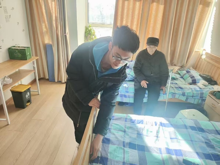 张凤彤同学则为老人测量血压,关注老人的身体健康状况,并耐心地为老人讲解日常保健知识。宋卓阳同学充分发挥专业知识,仔细检查养老中心的消防设施,确保老人们的居住安全。