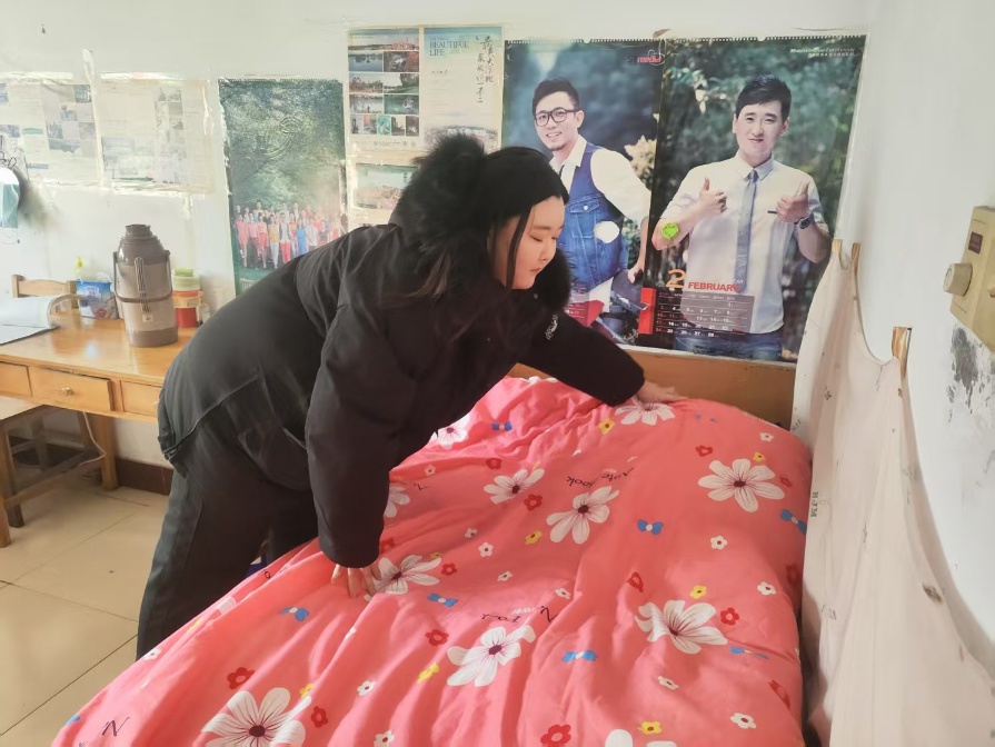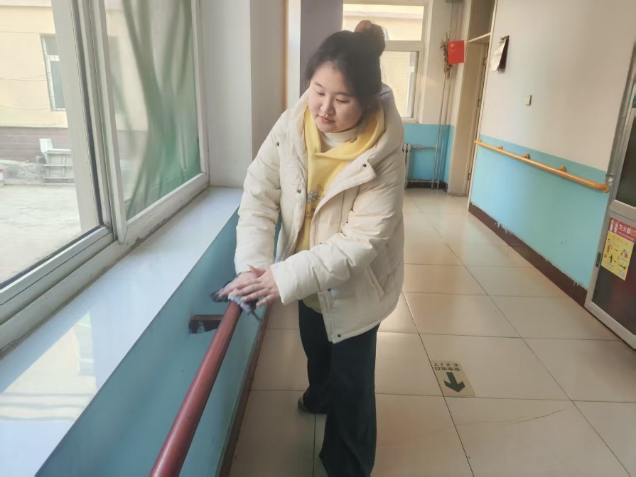 王梦柯不辞辛劳,为老人晒被子,让阳光的味道充满床铺,她还贴心地给老人擦了一下楼道扶手,让楼道卫生更加整洁。