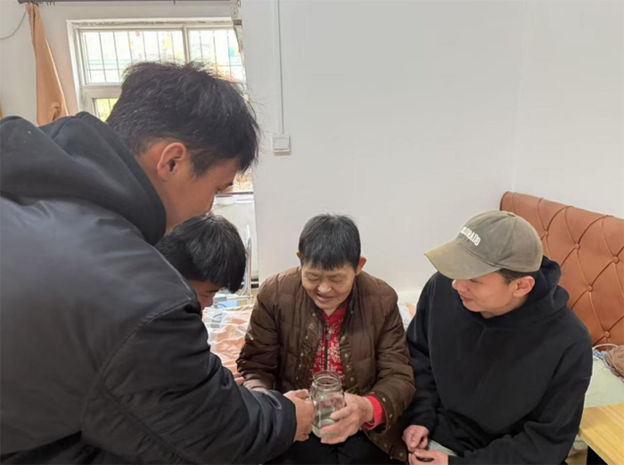 室内,另一组志愿者围坐在一位老人的床边,手中捧着一瓶水,耐心指导老人喝水。老人身穿棕色棉服,脸上漾起满足的笑容,双手轻握志愿者的手,眼中流露出感激。